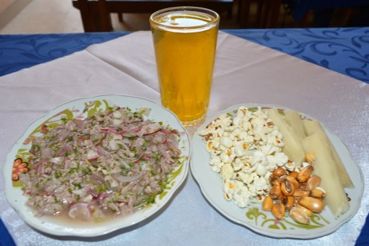 En las imágenes anteriores tenemos: El ceviche de carne de res (izquierda), considerado uno de los platos más típicos de la parroquia Sabiango, el café filtrado (derecha) bebida tradicional para acompañar bocaditos como: empanadas, humitas y el exquisito hornado de gallina criolla, entre otros.